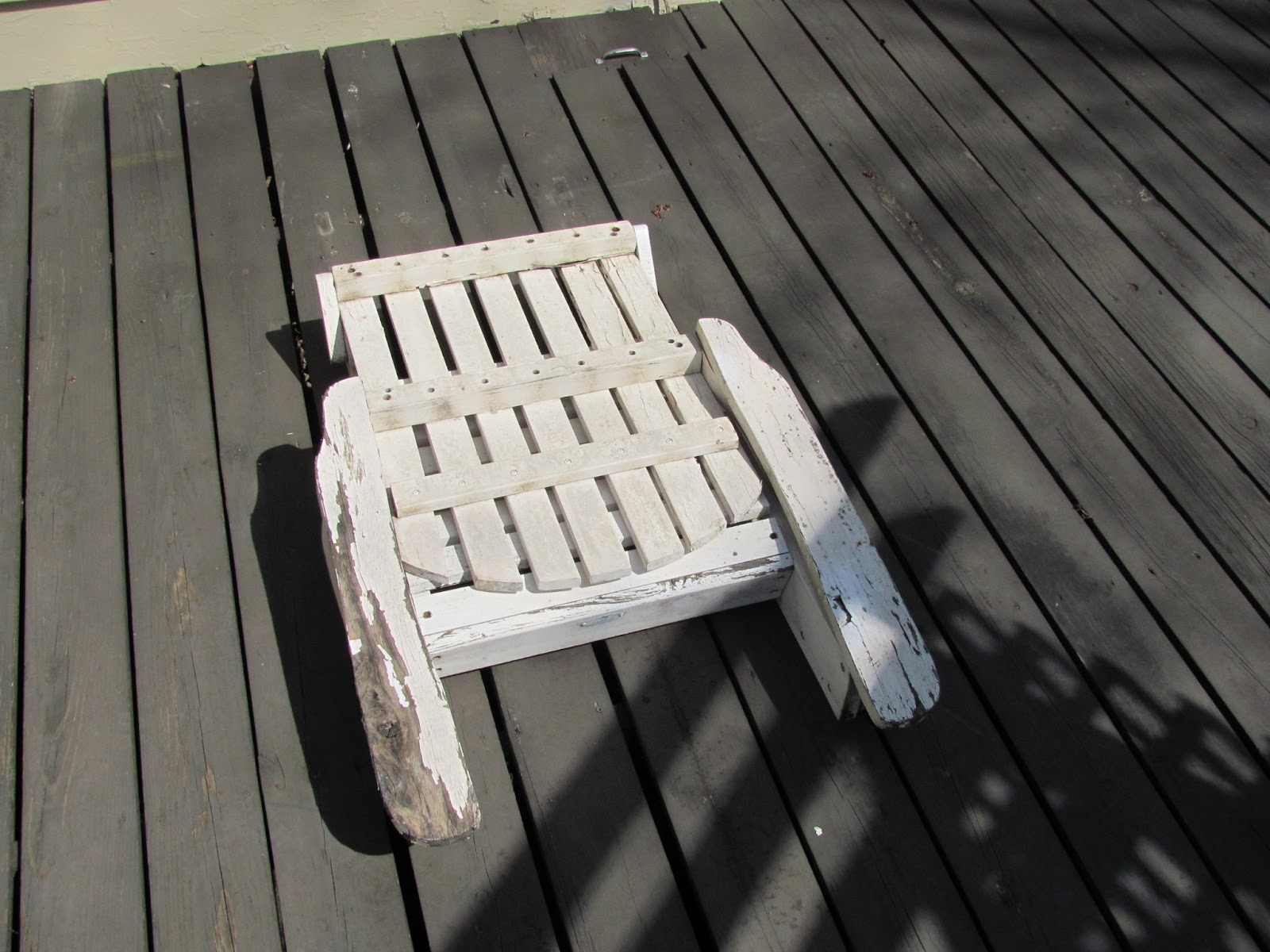 Anyway, that chair is not the subject of this post. The chair in the photo was the sister of the fallen, and she held on another year. The paint was chipped, the structure was wobbly, and it had to go. Our first plan was to set it out on clean-up week to be collected by either the sanitation workers or (more likely) the trollers who patrol the streets on clean-up week. I had already deconstructed and thrown out the footstools, but a spark hit me.